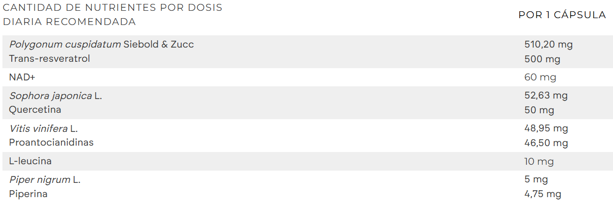 Extracto seco de raíz de hierba nudosa japonesa (Polygonum cuspidatum Siebold & Zucc.) 98% trans-resveratrol, cápsula [agente de recubrimiento (hidroxipropilmetilcelulosa), colorante (óxidos e hidróxidos de hierro)], NAD+ (nicotinamida adenina dinucleótido), extracto seco de botones florales de acacia del Japón (Sophora japonica L.) 95% quercetina, extracto seco de semilla de uva (Vitis vinifera L.) 95% OPC (proantocianidinas), L-leucina, antiaglomerantes (dióxido de silicio, sales magnésicas de ácidos grasos),extracto seco de fruto de pimienta negra (Piper nigrum L.) 95% piperina.