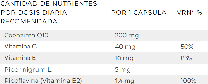 Coenzima Q10, agente de recubrimiento (hidroxipropilmetilcelulosa), agente de carga (celulosa microcristalina), vitamina E (acetato de DL-alfa-tocoferilo), vitamina C (ácido L-ascórbico), antiaglomerante (sales magnésicas de ácidos grasos), polvo de fruto de pimienta negra (Piper nigrum L.)*, antiaglomerante (dióxido de silicio), riboflavina (riboflavina).