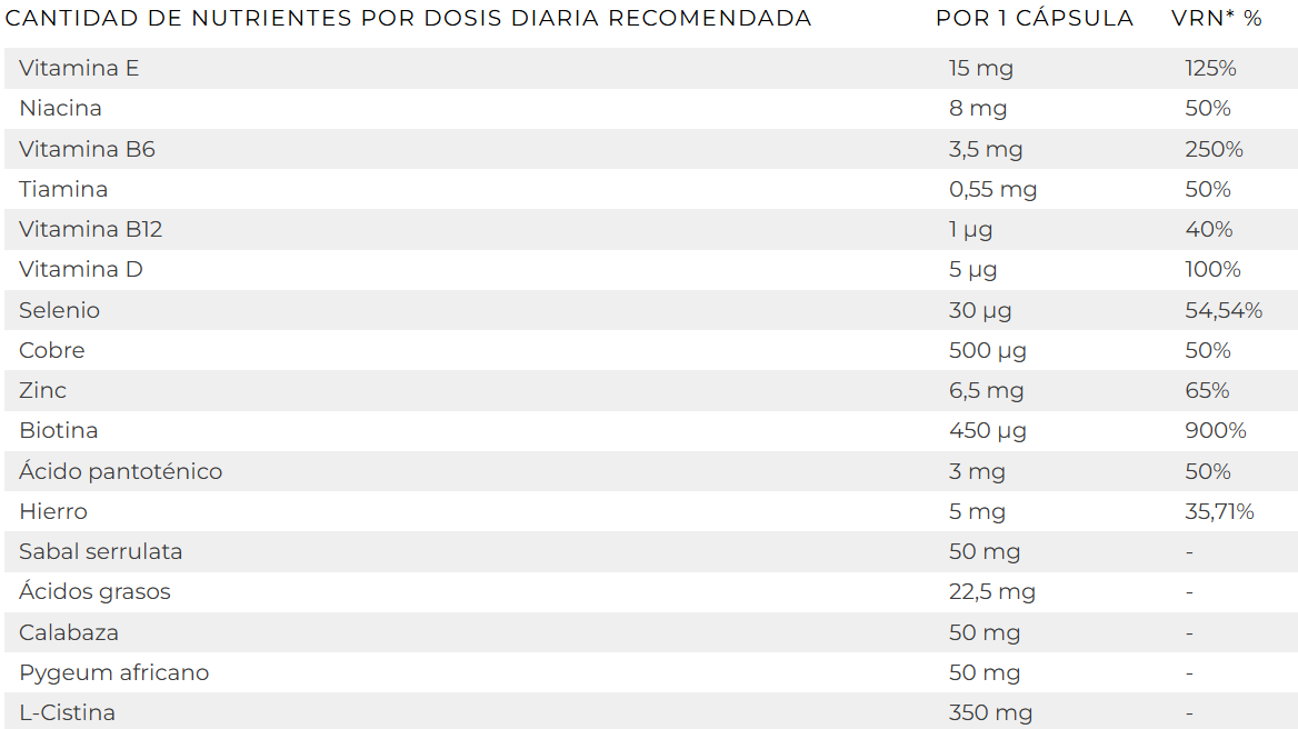 L-cistina, cápsula (agente de recubrimiento: hidroxipropilmetilcelulosa), extracto seco de semillas de calabaza (Cucurbita pepo L.), extracto seco de Sabal (Serenoa repens (W. Bartram) Small, fruto), extracto seco de corteza de Pygeum africano (Prunus africanum Hook. F.), acetato de DL-alfa-tocoferilo (vitamina E), bisglicinato ferroso, citrato de zinc, nicotinamida (niacina), antiaglomerantes (sales magnésicas de ácidos grasos y dióxido de silicio), clorhidrato de piridoxina (vitamina B6), D-pantotenato cálcico (ácido pantoténico), colecalciferol (vitamina D), citrato cúprico, metilcobalamina (vitamina B12), clorhidrato de tiamina (vitamina B1), D-biotina (biotina), selenito de sodio.